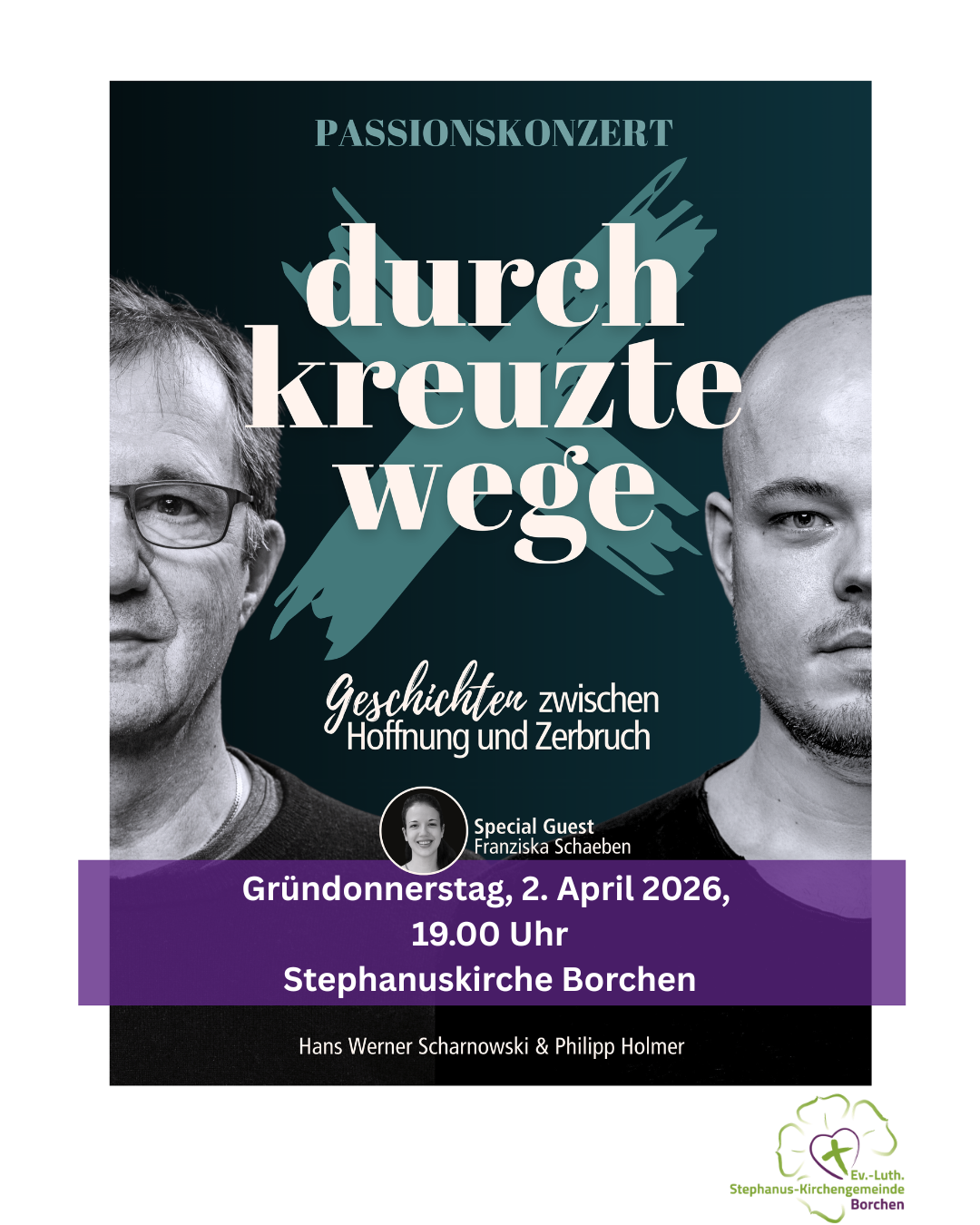 Bei uns wird der Gründonnerstag in diesem Jahr anders gestaltet. Wir laden ein am 2. April 2026 um 19.00 Uhr in die Stephanuskirche zu einem Passionskonzert. Unter dem Titel „Durchkreuzte Wege“ nehmen Hans Werner Scharnowski und Philipp Holmer die Besucherinnen und Besucher mit auf eine eindrückliche Reise durch die Passionszeit. Unterstütz ...