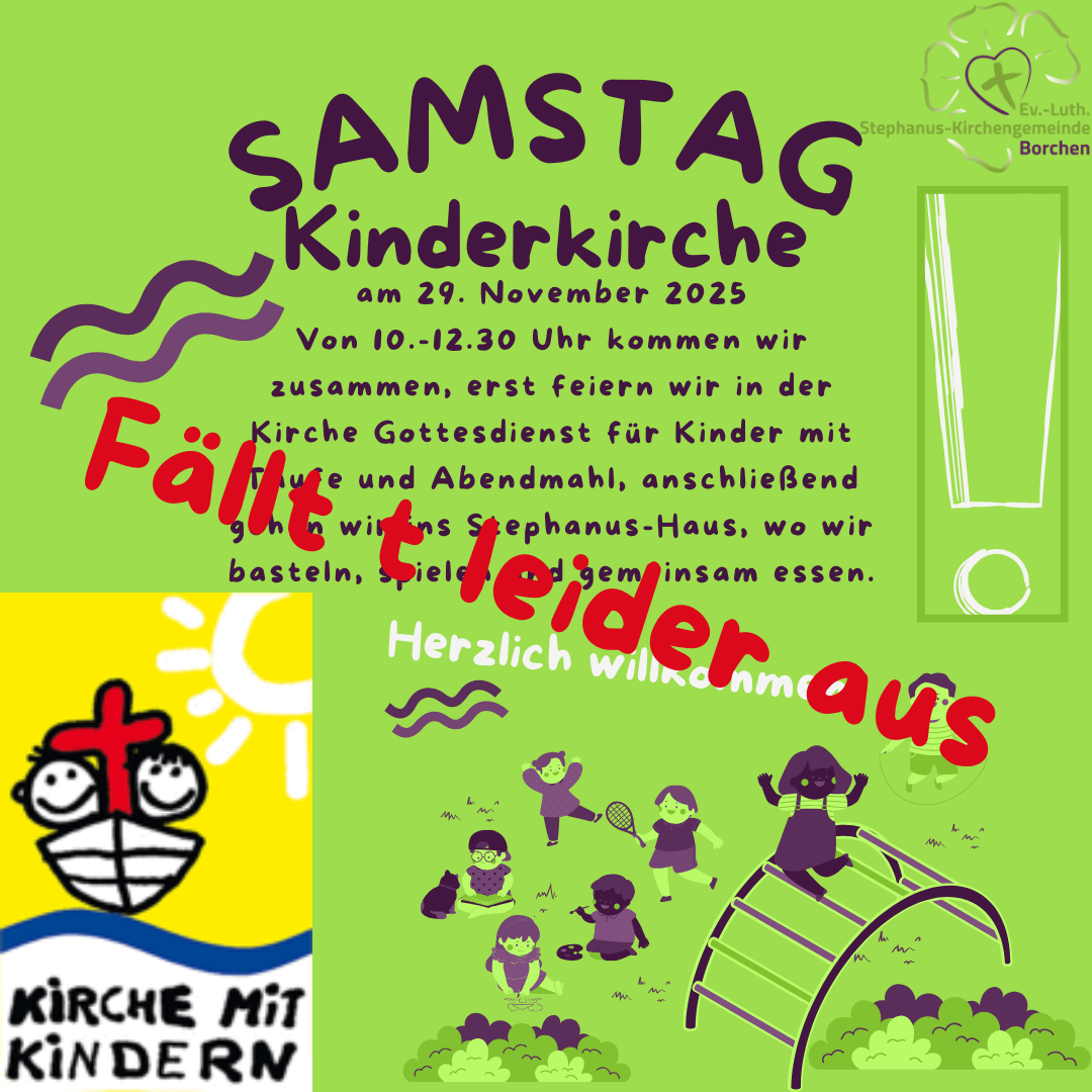 Am Samstag, den 29. November, laden wir Kinder im Kindergarten- und Grundschulalter in die Kinderkirche ein. Wir laden ein zum gemeinsamen Abendmahl. Im Anschluss an den Gottesdienst wollen wir im Stephanus-Haus basteln und spielen. Zum Schluss esse ...