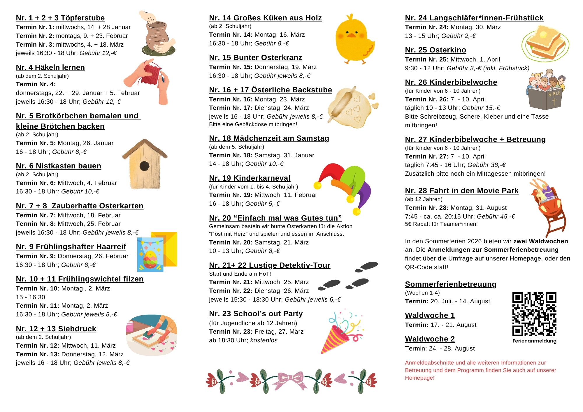 - Die Ferienbetreuung ist nur für die gesamte Woche (Montag bis Freitag) buchbar.